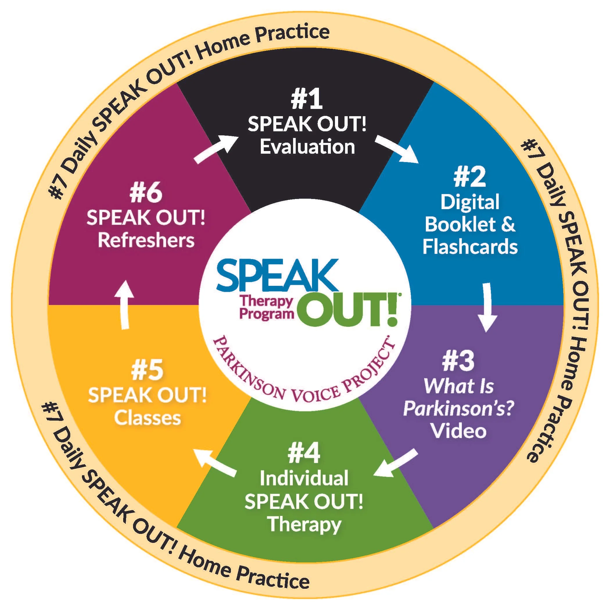 The SPEAK OUT!® Therapy Program, developed by the nonprofit organization, Parkinson Voice Project®, helps people with Parkinson’s and related disorders regain and retain their speech and swallowing. The program can improve volume, articulation, breath support for speech, vocal quality, intonation, and facial expression. This highly effective, research-based treatment combines education, individual and group speech therapy, daily home practice, and continuous follow-ups. Patients are empowered to “speak with INTENT,” transitioning speech from an automatic function to an intentional act. The “Circle of INTENT” outlines the various therapy components and emphasizes that this program is lifelong.